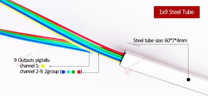 1x9 onevenwichtige splitter gebruiken dezelfde stalen buis 60 * 7 * 4 mm als 1x8 splitter, input 1, output 9 = 4 * 2 + 1pcs vezel array.