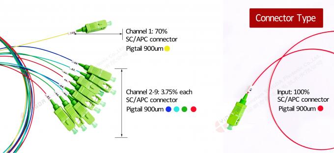 Om de split ratio te onderscheiden, gebruik verschillende kleuren zoals blauw om te markeren, deze speciale chip 1x9 zorgen voor onevenwichtige split ratio niet gelijke soorten,die aan speciale eisen en flexibele optische toepassingen kan voldoen, en wordt veel gebruikt in 5G FTTR-netwerken;