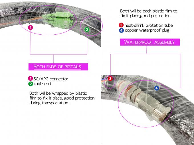 De waterdichte vezelvlecht/het Flardkoord kan in ruw milieu worden gebruikt. Het wordt hoofdzakelijk gebruikt in openluchtverbinding van de optische zender. De waterdichte vezelvlecht wordt ontworpen met een roestvrij staal versterkte waterdichte eenheid en gepantserde openluchtpe beklede kabels.